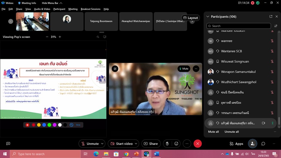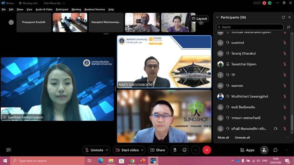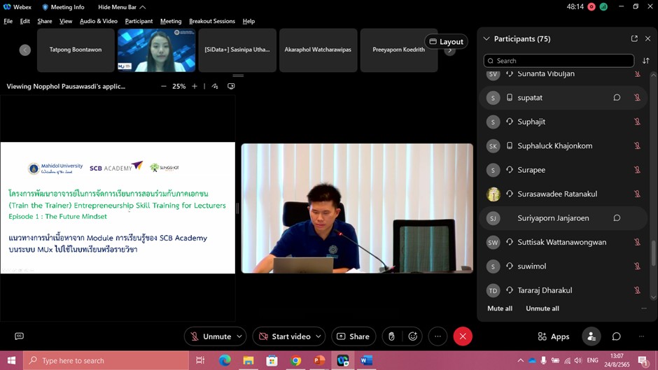 วันที่ 24 สิงหาคม พ.ศ. 2565 รองศาสตราจารย์ ดร. เภสัชกรเนติ สุขสมบูรณ์ รองอธิการบดีฝ่ายการศึกษา เป็นประธานกล่าวเปิดโครงการพัฒนาอาจารย์ในการจัดการเรียนการสอนร่วมกับภาคเอกชน (Train the Trainer) Entrepreneurship Skill Training for Lecturers – EP 1 : The Future Mindset โดยมี คุณอภิวุฒิ พิมลแสงสุริยา ผู้ก่อตั้ง บริษัท สลิงชอท กรุ๊ป ให้เกียรติเป็นวิทยากร ร่วมด้วย ผู้ช่วยศาสตราจารย์ ดร. นพพล เผ่าสวัสดิ์ ผู้อำนวยการหอสมุดและคลังความรู้ มหาวิทยาลัยมหิดล