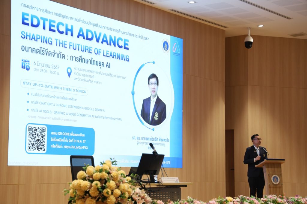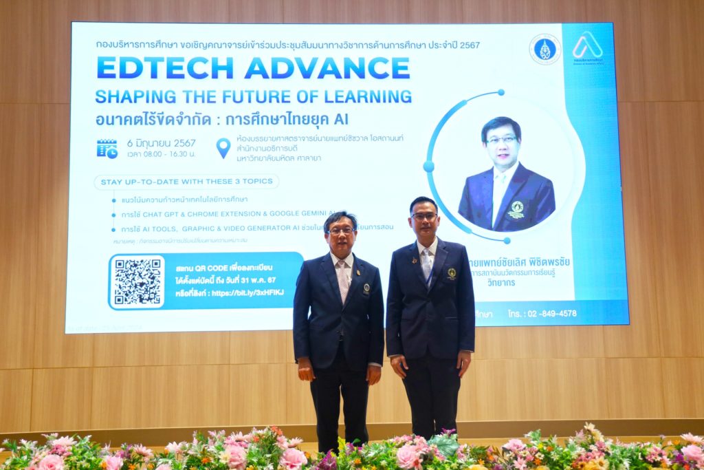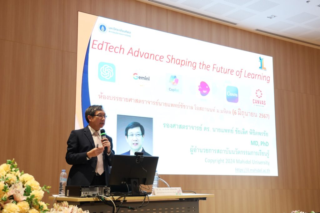 วันที่ 6 มิถุนายน 2567 รองศาสตราจารย์ ดร. เภสัชกรเนติ สุขสมบูรณ์ รองอธิการบดีฝ่ายการศึกษา มหาวิทยาลัยมหิดล เป็นประธานเปิดโครงการประชุมสัมมนาทางวิชาการด้านการศึกษา ประจำปี 2567 เรื่อง “Edtech Advance : Shaping the future of learning อนาคตไร้ขีดจำกัด : การศึกษาไทยยุค AI” ซึ่งกองบริหารการศึกษา มหาวิทยาลัยมหิดล จัดขึ้นเพื่อส่งเสริมให้อาจารย์มีความรู้ ความสามารถ ในการนำเสนอแนวทางการสอนที่ทันสมัย น่าสนใจ และช่วยให้นักเรียนเรียนรู้ได้อย่างมีประสิทธิภาพ ตลอดจนสามารถนำสื่อต่าง ๆ มาประยุกต์ใช้ได้อย่างเหมาะสม โดยได้รับเกียรติจาก รองศาสตราจารย์ ดร. นายแพทย์ชัยเลิศ พิชิตพรชัย ผู้อำนวยการ สถาบันนวัตกรรมการเรียนรู้ มหาวิทยาลัยมหิดล เป็นวิทยากรบรรยาย ให้แก่อาจารย์จากส่วนงานภายในมหาวิทยาลัยมหิดล ณ ห้องบรรยาย ศาสตราจารย์ นายแพทย์ชัชวาล โอสถานนท์ สำนักงานอธิการบดี มหาวิทยาลัยมหิดล ศาลายา