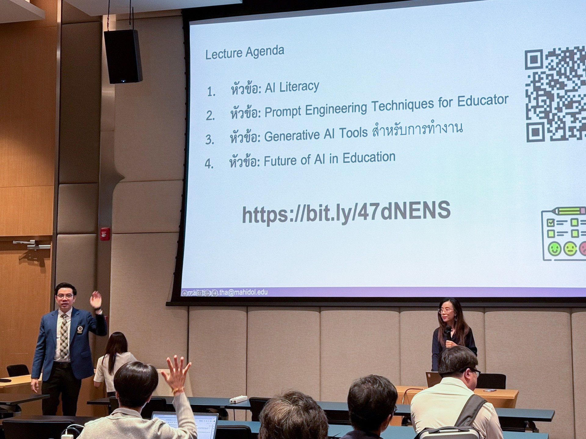 วันที่ 5 สิงหาคม 2568 ศาสตราจารย์ ดร. เภสัชกรเนติ สุขสมบูรณ์ รองอธิการบดีฝ่ายการศึกษา มหาวิทยาลัยมหิดล เป็นประธานเปิดโครงการอบรมเชิงปฏิบัติการ : เพิ่มประสิทธิภาพด้าน Generative AI สำหรับอาจารย์มหาวิทยาลัยมหิดล (Mahidol Workshop: Enhancing Generative AI Literacy for Educators) สำหรับอาจารย์สาขา Biomedical & Life Sciences and Technology โดยมี อาจารย์ ดร.เจษฎา อานิล ผู้ช่วยอธิการบดีฝ่ายการศึกษา มหาวิทยาลัยมหิดล รองศาสตราจารย์ ดร. นายแพทย์ชัยเลิศ พิชิตพรชัย ผู้อำนวยการสถาบันนวัตกรรมการเรียนรู้ มหาวิทยาลัยมหิดล และผู้ช่วยศาสตราจารย์ ดร. ทิพาจินต์ ไทยพิสุทธิกุล คณะเทคโนโลยีสารสนเทศและการสื่อสาร มหาวิทยาลัยมหิดล เป็นวิทยากรในโครงการ ณ ศูนย์ประชุมและอาคารจอดรถมหิดลสิทธาคาร มหาวิทยาลัยมหิดล ศาลายา
